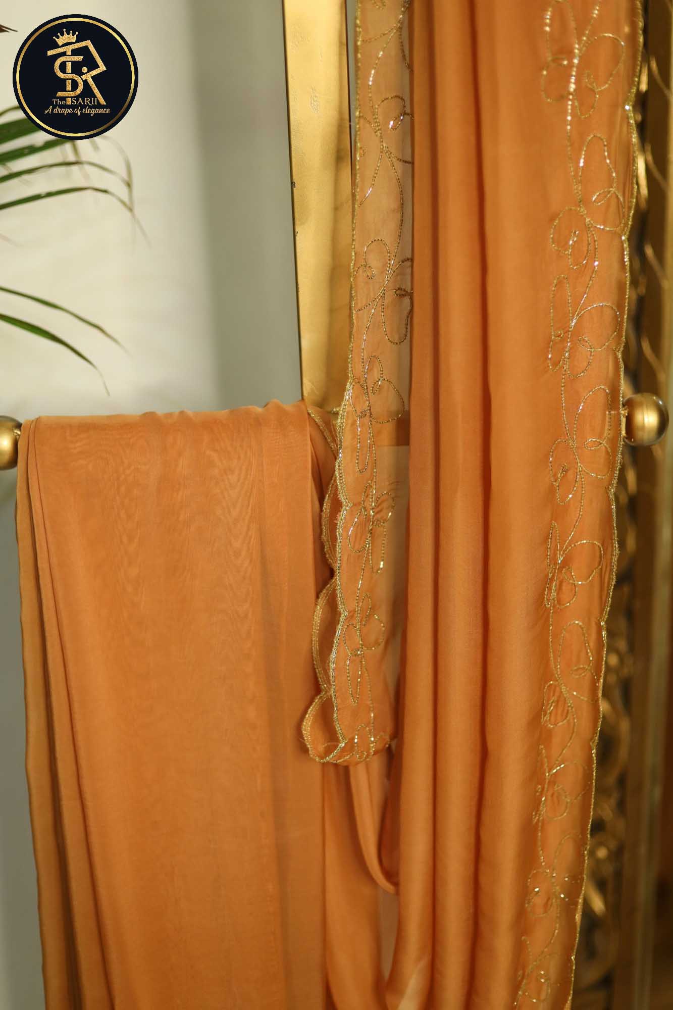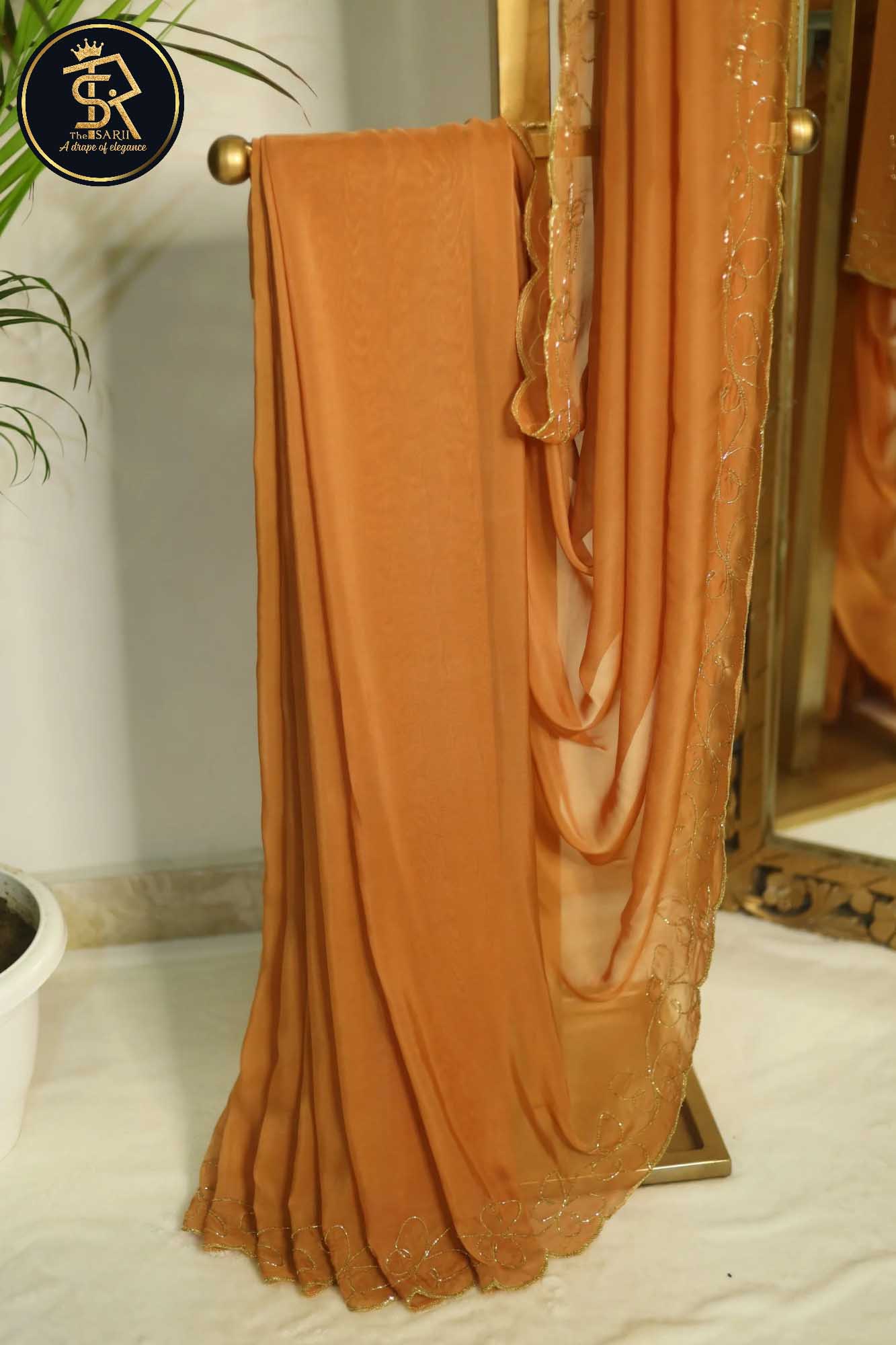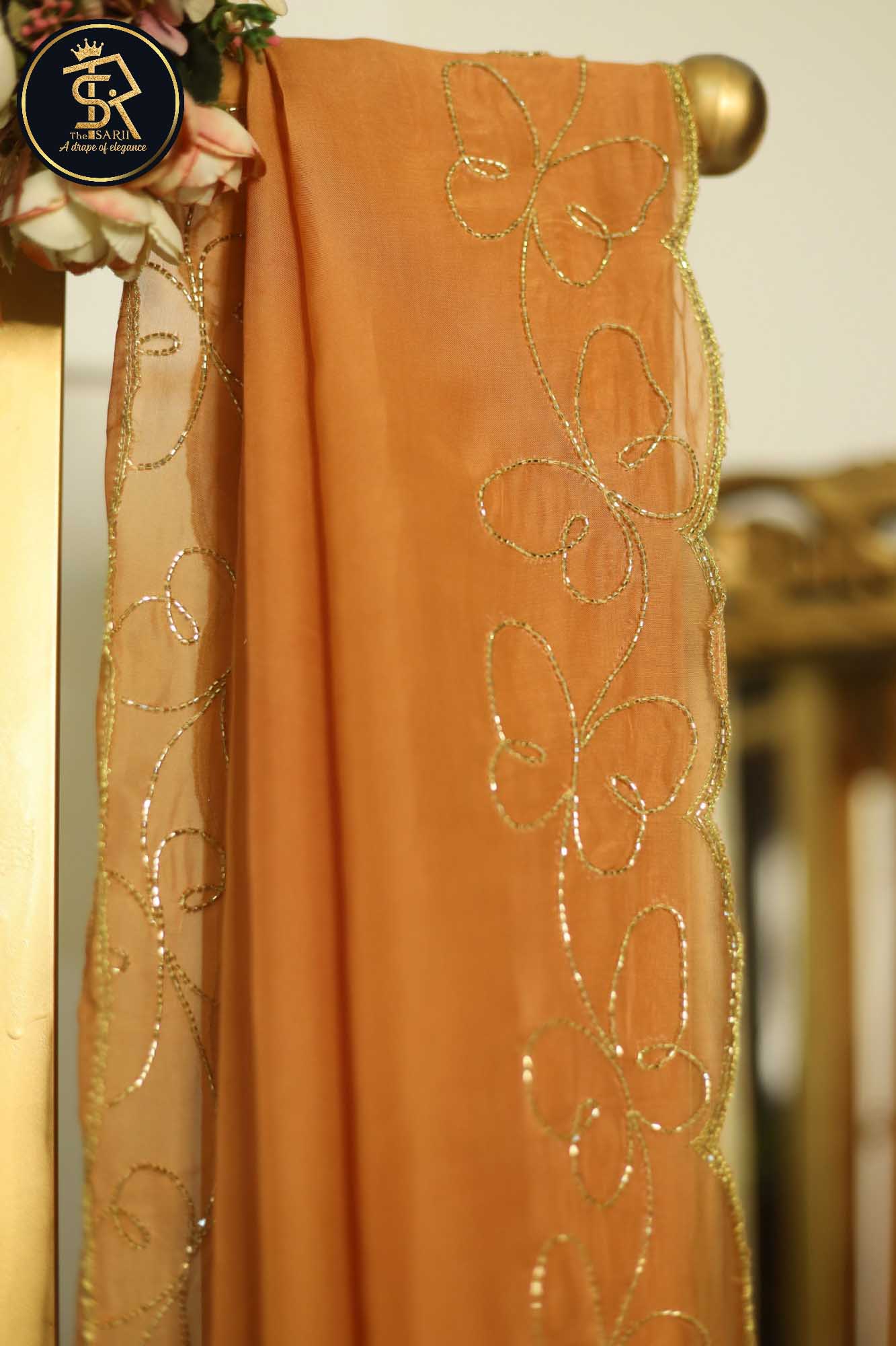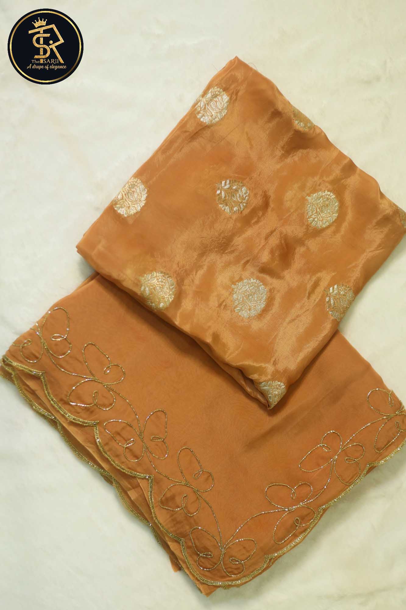 Step into soft elegance with this enchanting viscose organza biscuity-peach saree, a perfect blend of subtle charm and festive allure. The biscuity-peach hue offers a warm, graceful glow, while the airy organza fabric gives the saree a light, ethereal drape that moves with effortless sophistication.