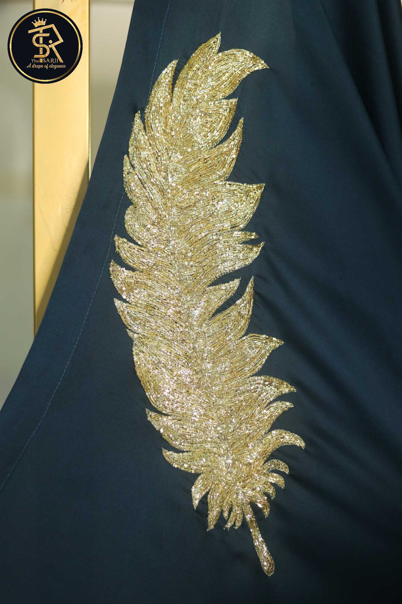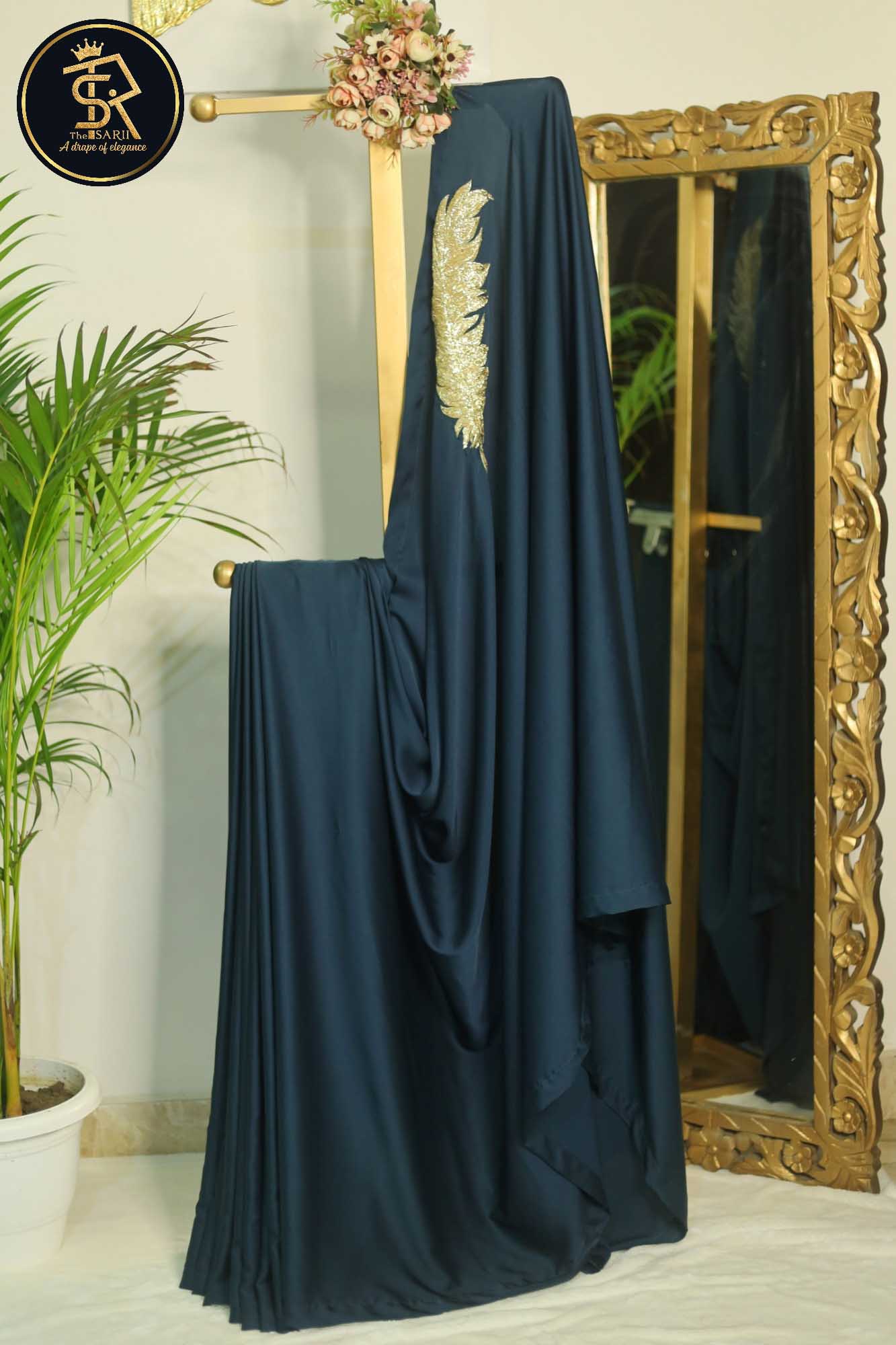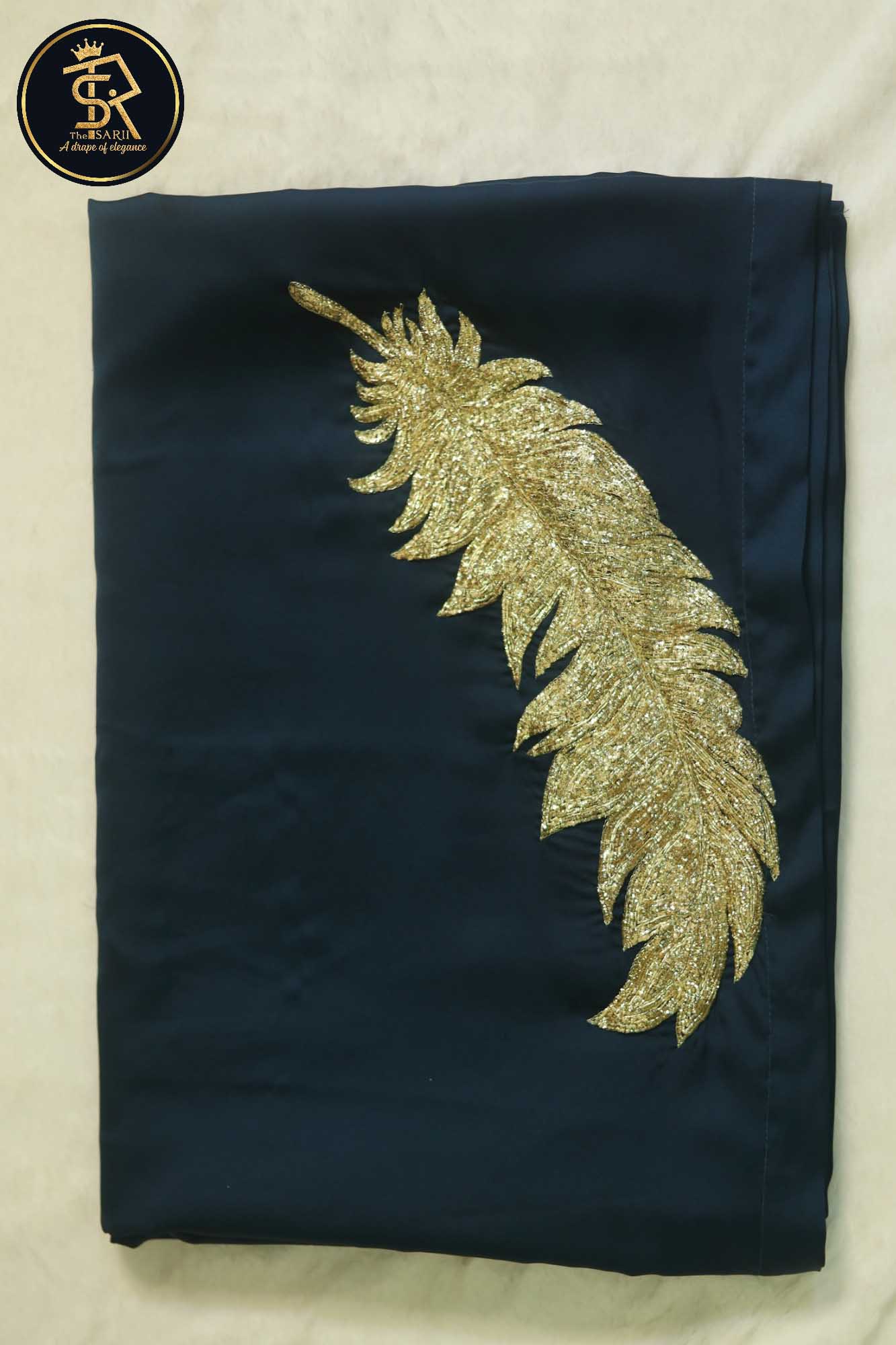 The saree is beautifully embroidered with a delicate feather motif, adding a touch of liveliness and artistic charm. The feather, symbolic of beauty and lightness, brings movement and freshness to the ensemble—making the saree feel dynamic, expressive, and full of life. Each stitch is thoughtfully placed to enhance the natural shimmer of Armani satin, creating a refined yet striking visual appeal.