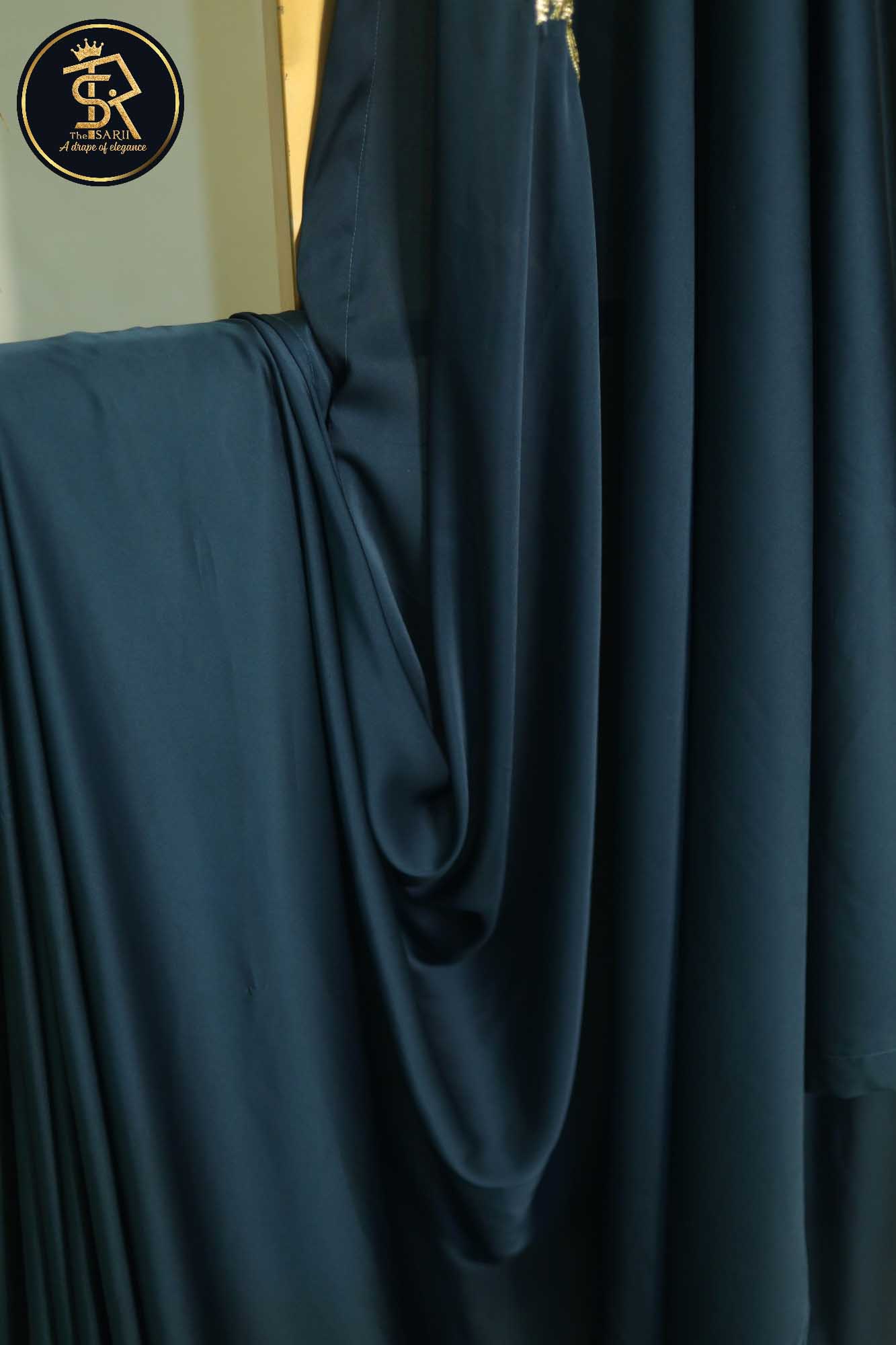 Immerse yourself in luxurious brilliance with this Armani satin peacock-colour cocktail saree, crafted to make every moment feel extraordinary. The rich peacock shade radiates depth and vibrance, capturing the perfect balance between sophistication and festive glamour. Its satin body drapes with a smooth, liquid sheen, creating a silhouette that is both bold and effortlessly graceful.