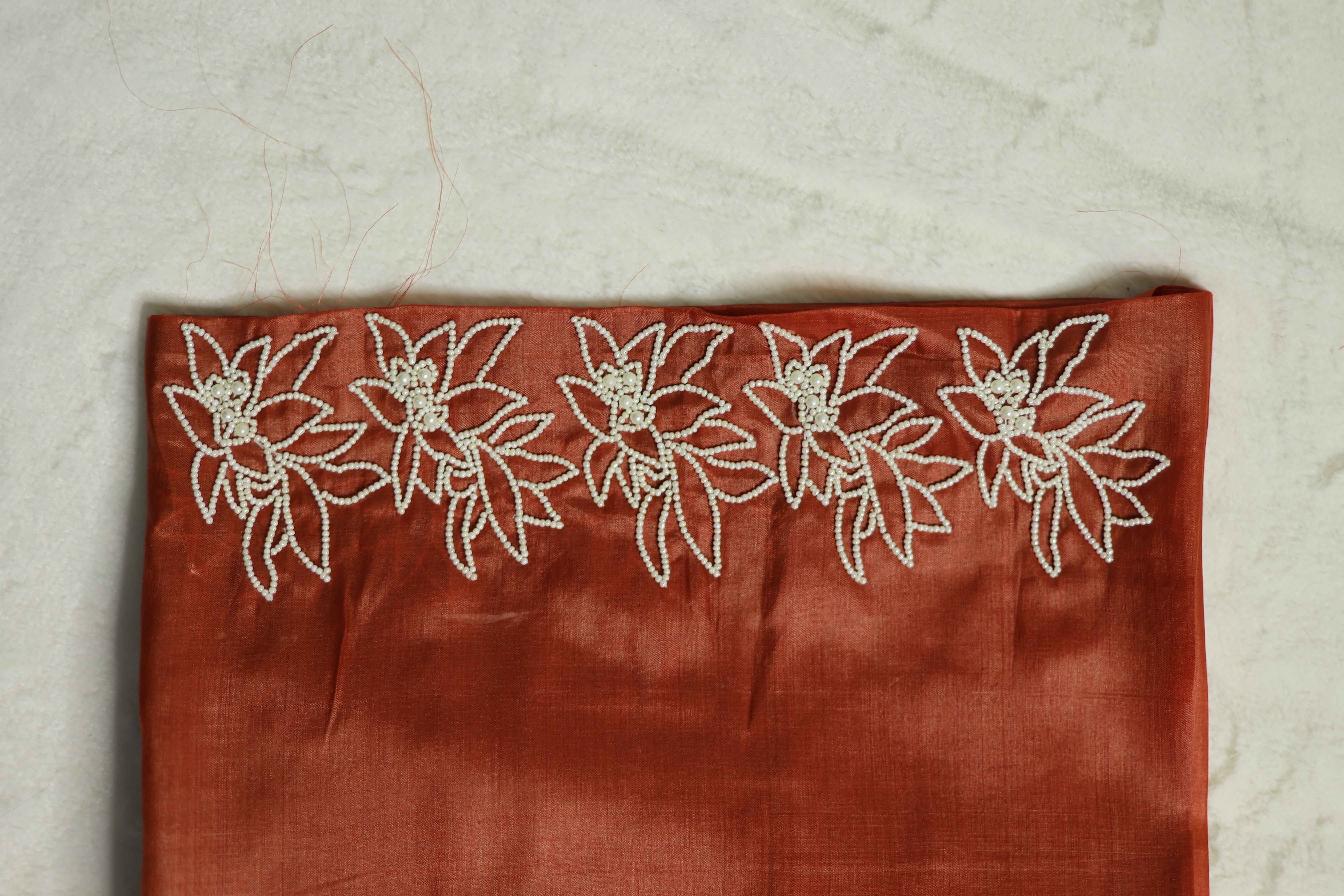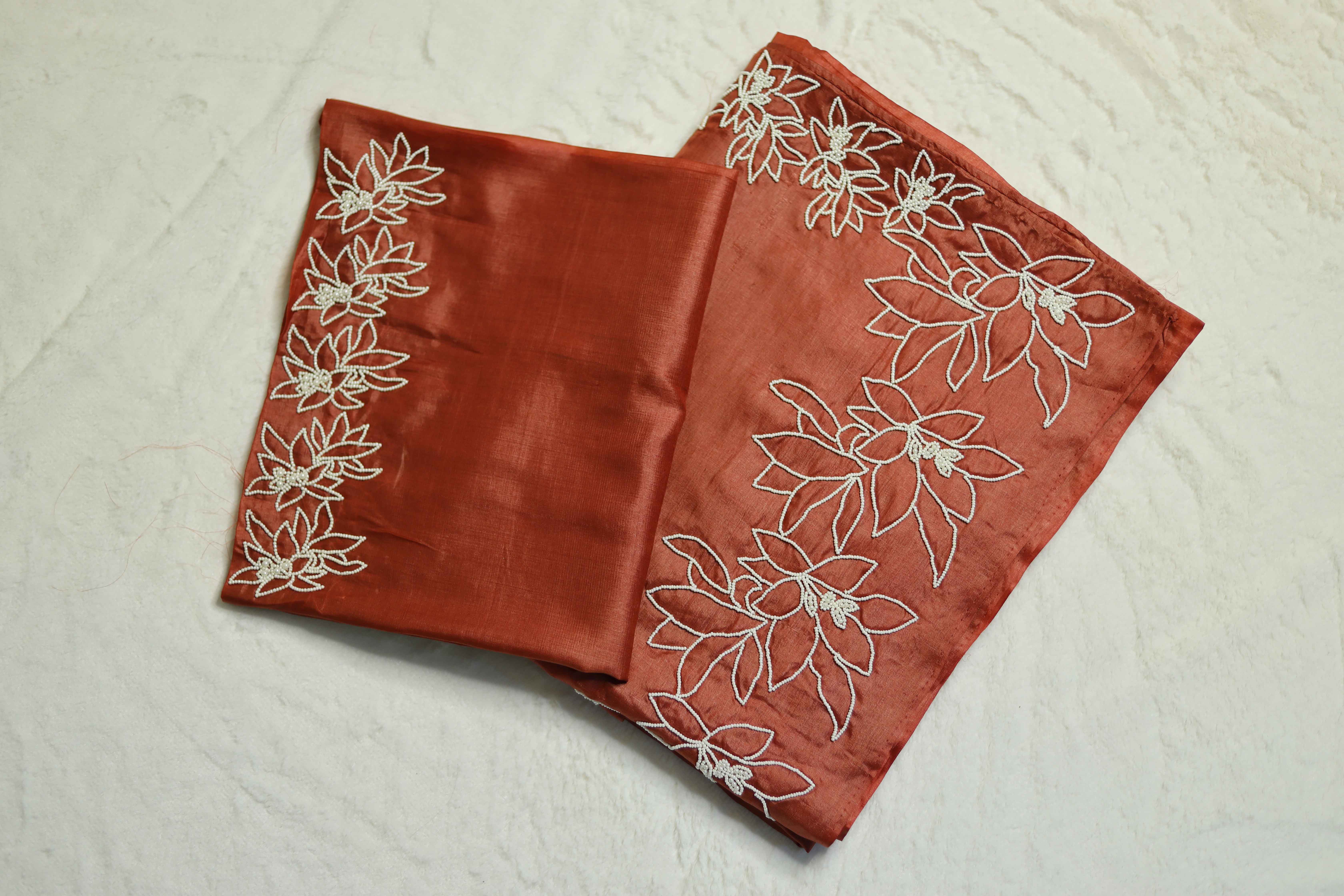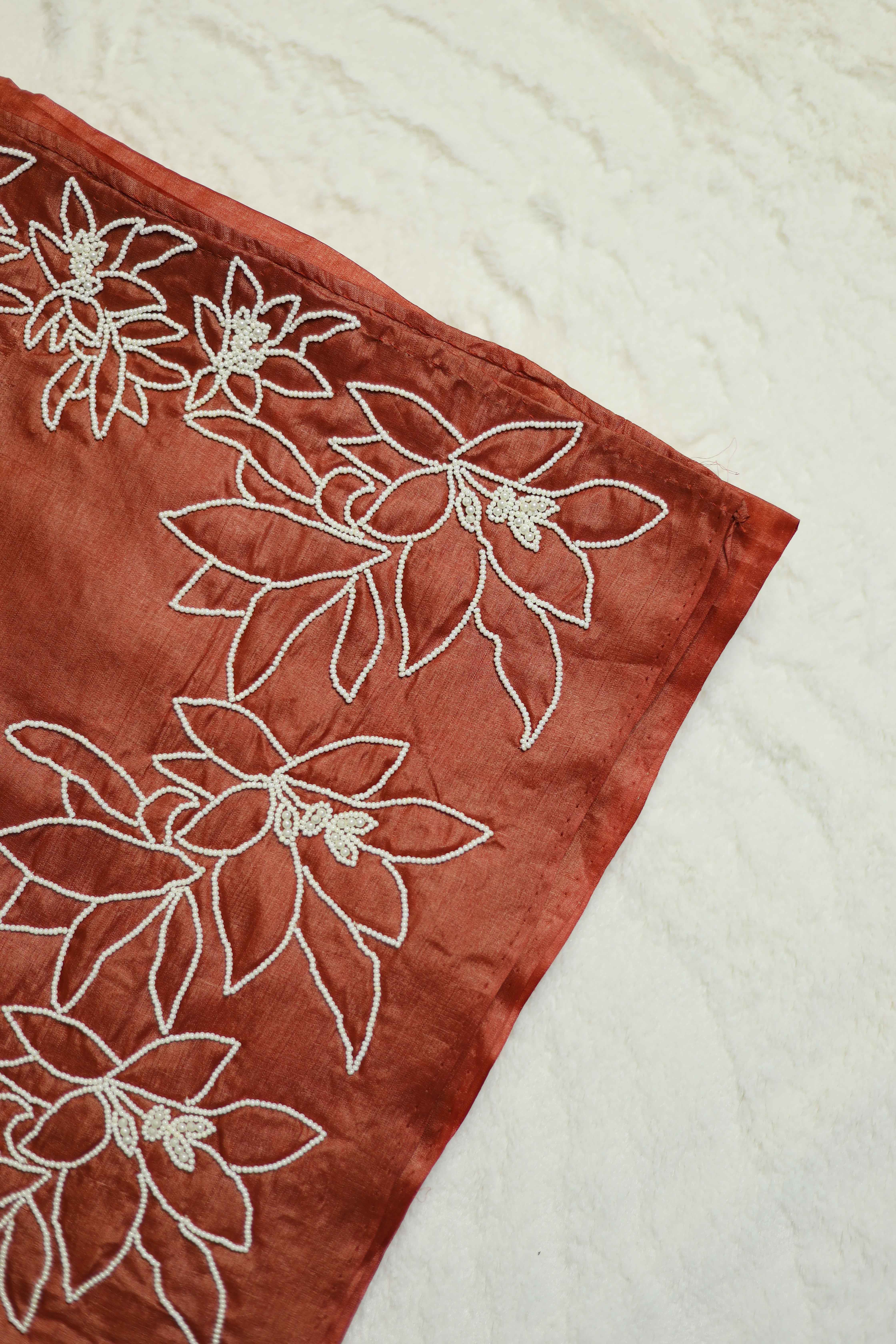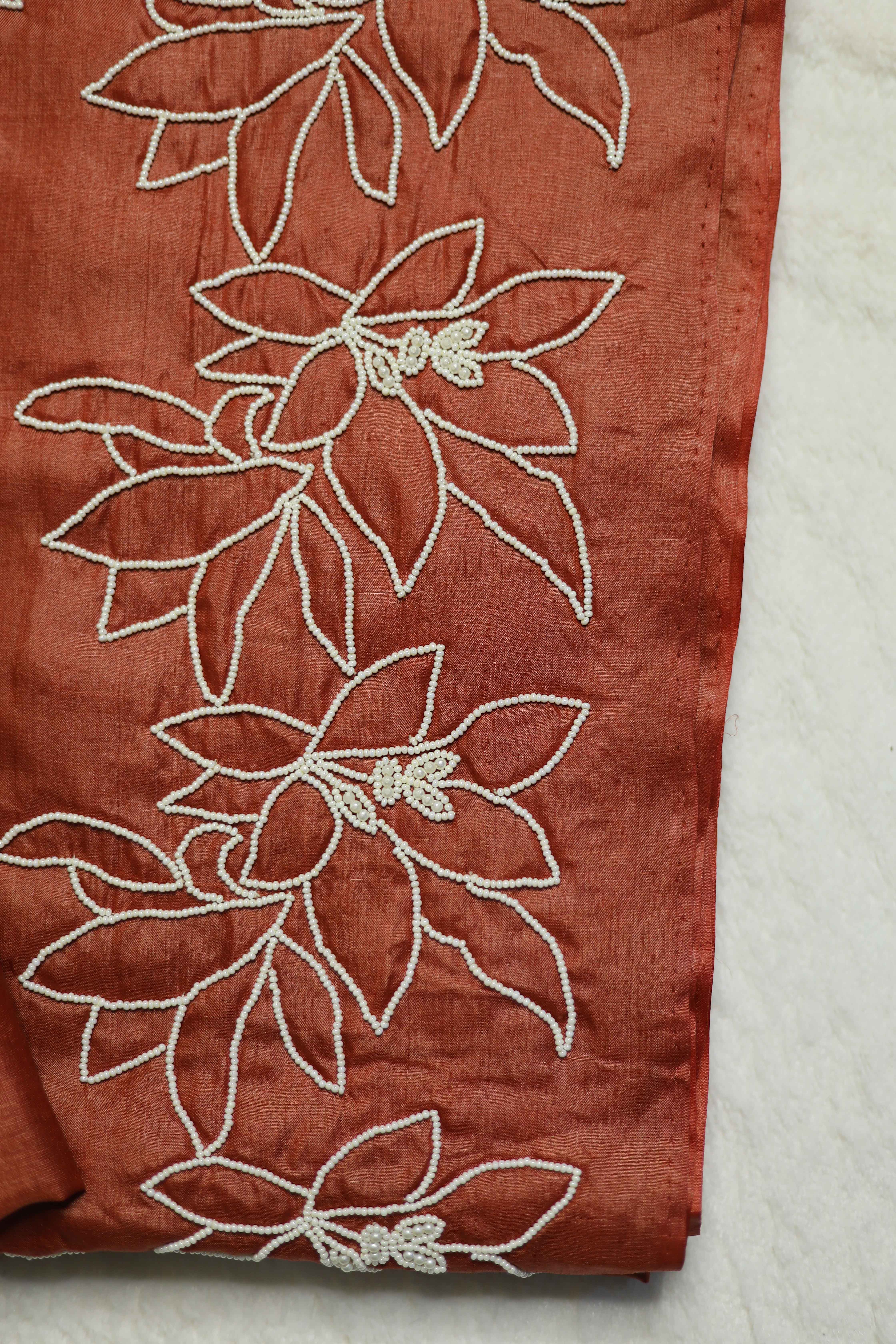 Pure Tussar silk chocolate shade saree with delicate pearl work , a timeless blend of tradition and elegance