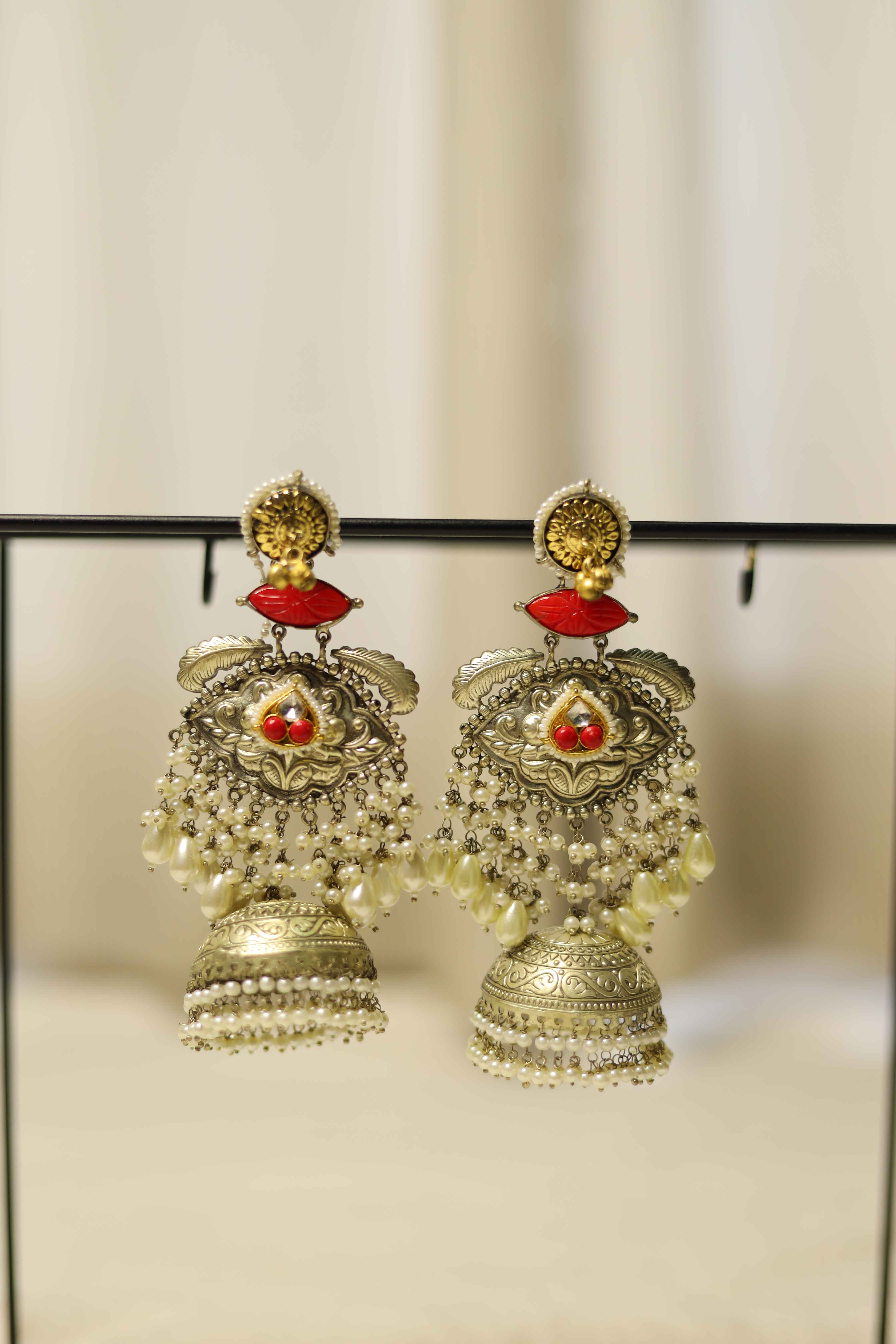 Showcase timeless elegance with these antique silver-finish jhumka earrings, intricately designed with traditional motifs and highlighted with bold red stone accents. The cascading pearl tassels and teardrop beads add graceful movement, while the engraved dome-shaped jhumkas complete the ethnic charm. Perfect for weddings, festive celebrations, and cultural gatherings, these statement earrings beautifully complement sarees, lehengas, and Indo-western attire.