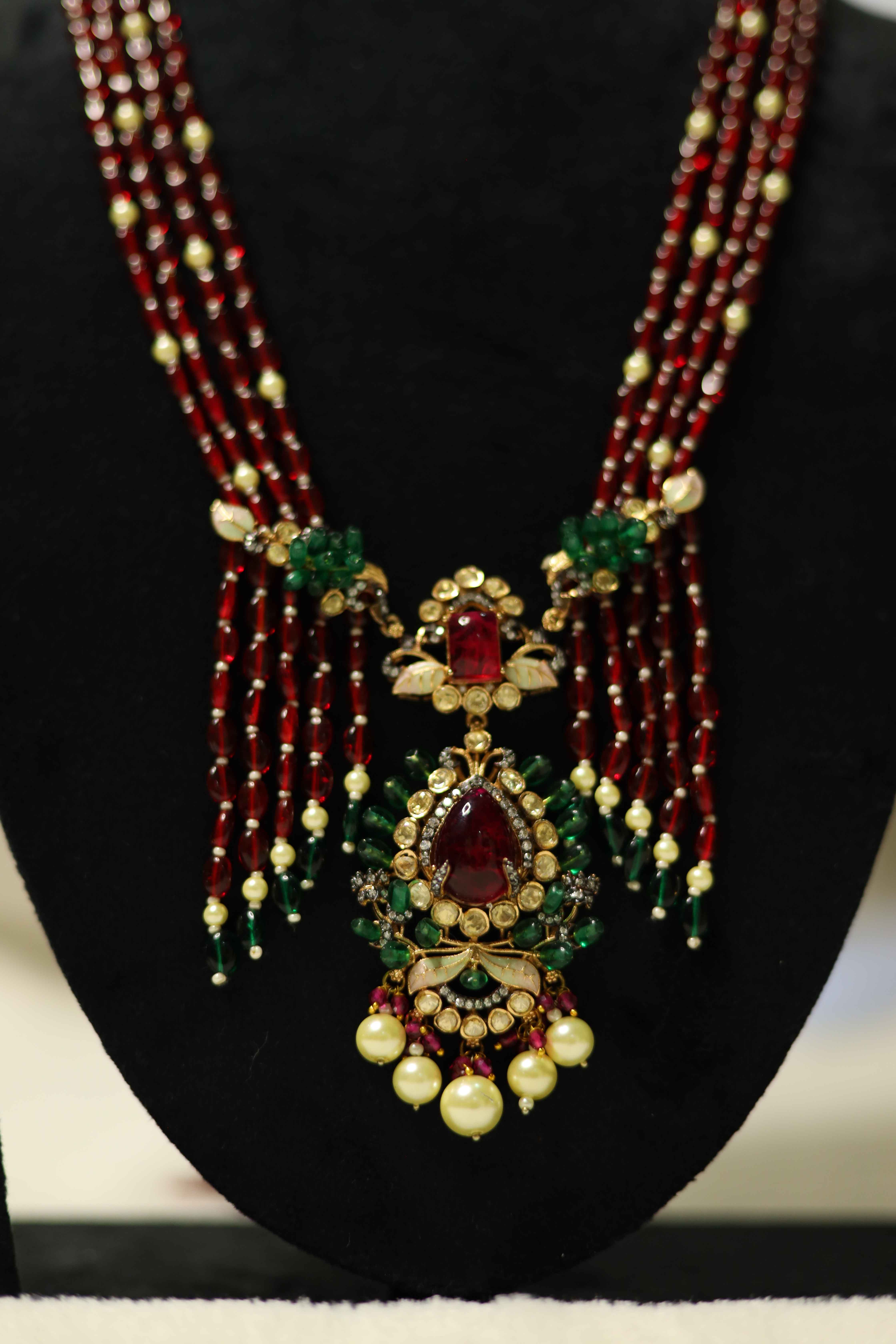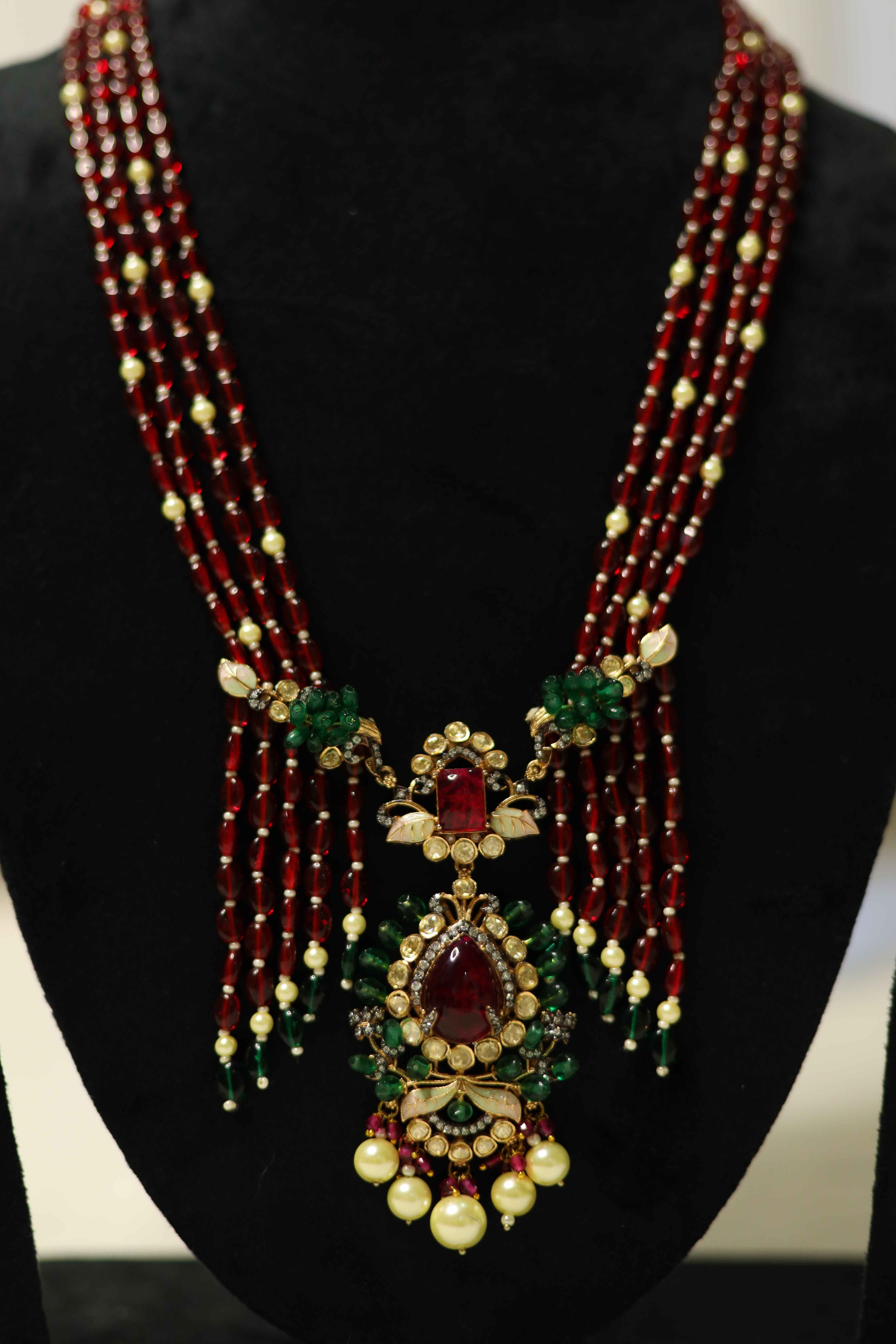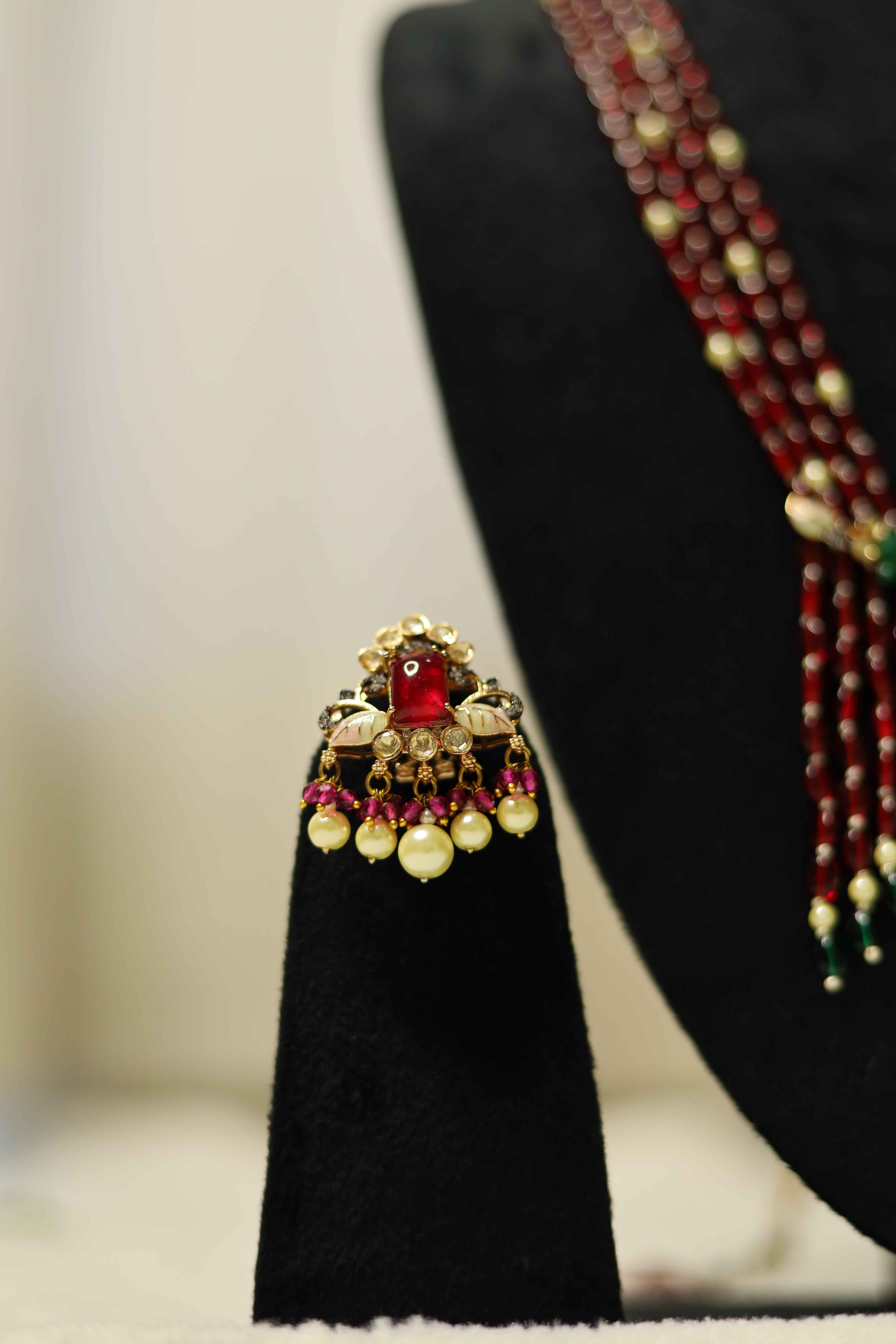 Enhance your regal charm with this opulent multi-layer ruby beaded necklace set, featuring an intricately designed Kundan pendant adorned with green accents and delicate pearl drops. The set comes with matching statement earrings, making it perfect for weddings, festive occasions, and royal celebrations. A masterpiece of traditional craftsmanship with a modern royal touch.