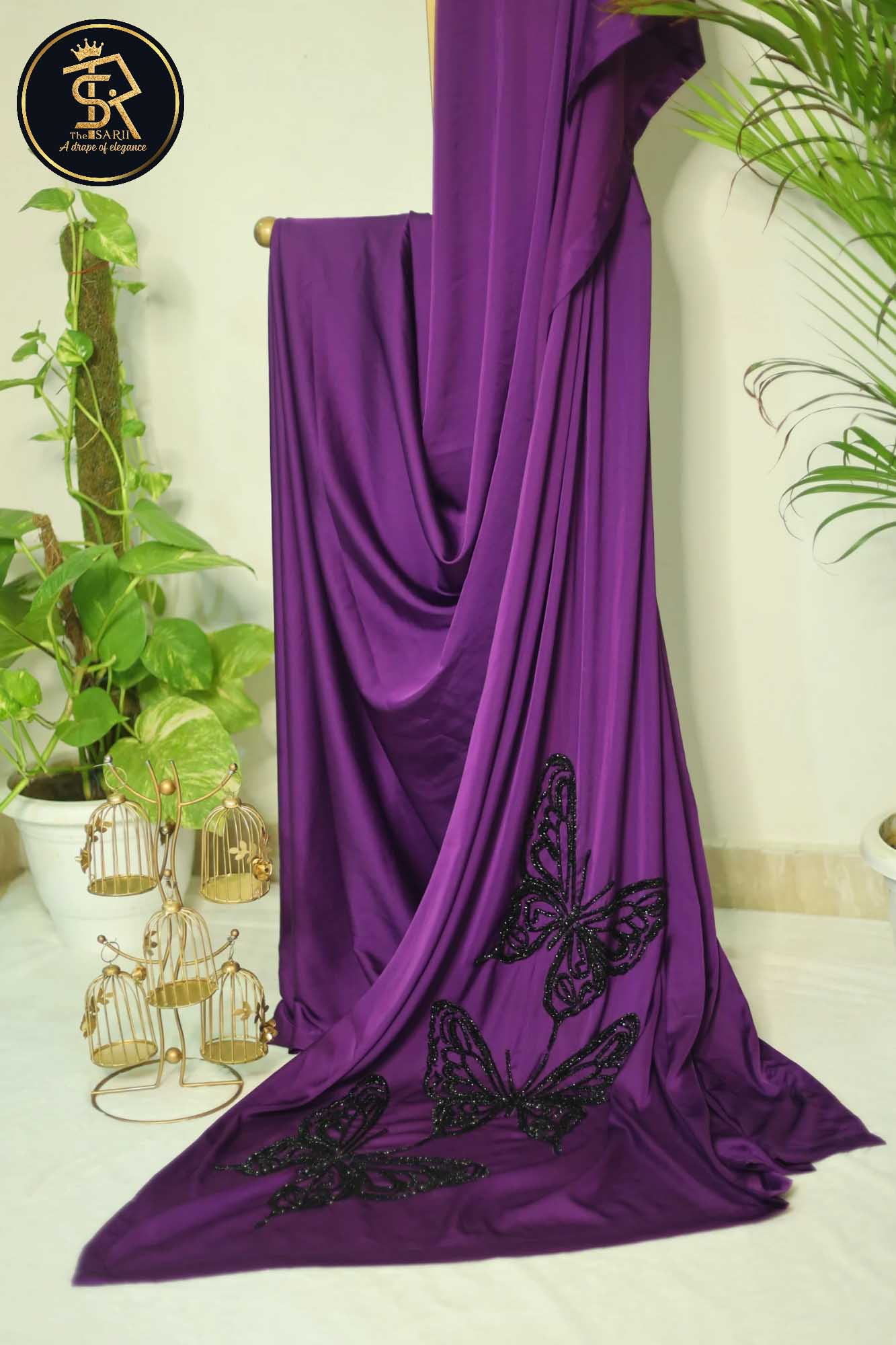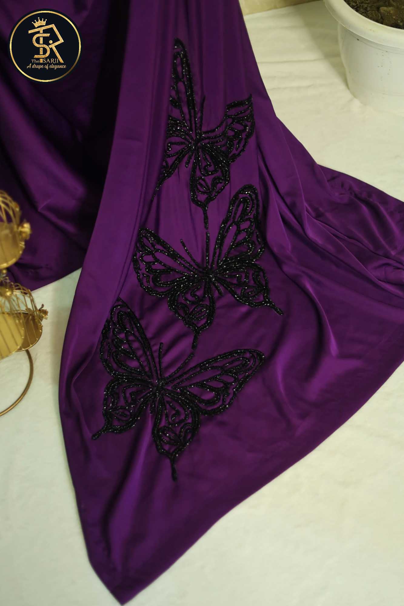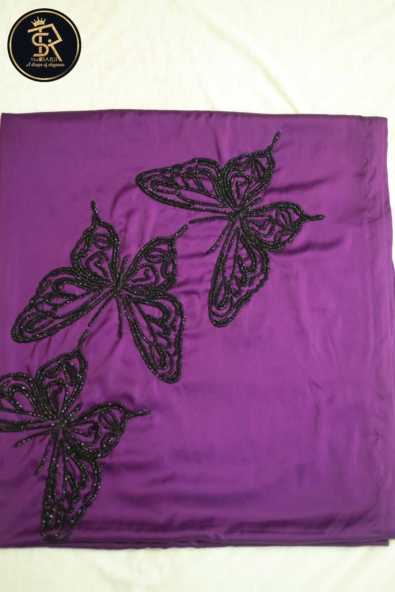 The saree is beautifully adorned with black Katdana embroidery, creating a striking contrast against the lush purple base. Each handworked detail adds depth, shine, and artistic finesse, enhancing the saree’s refined silhouette with just the right touch of sparkle.