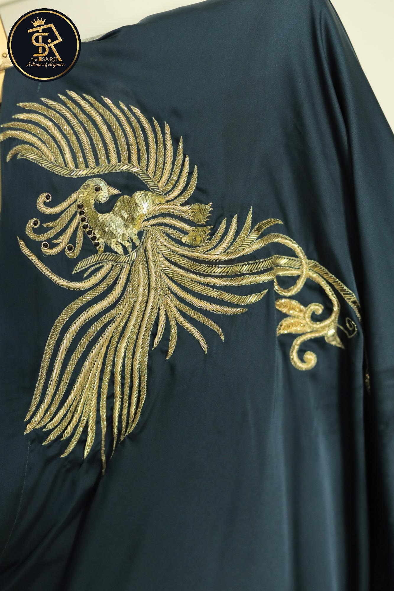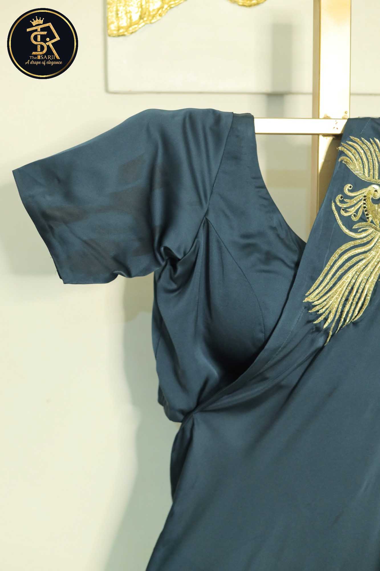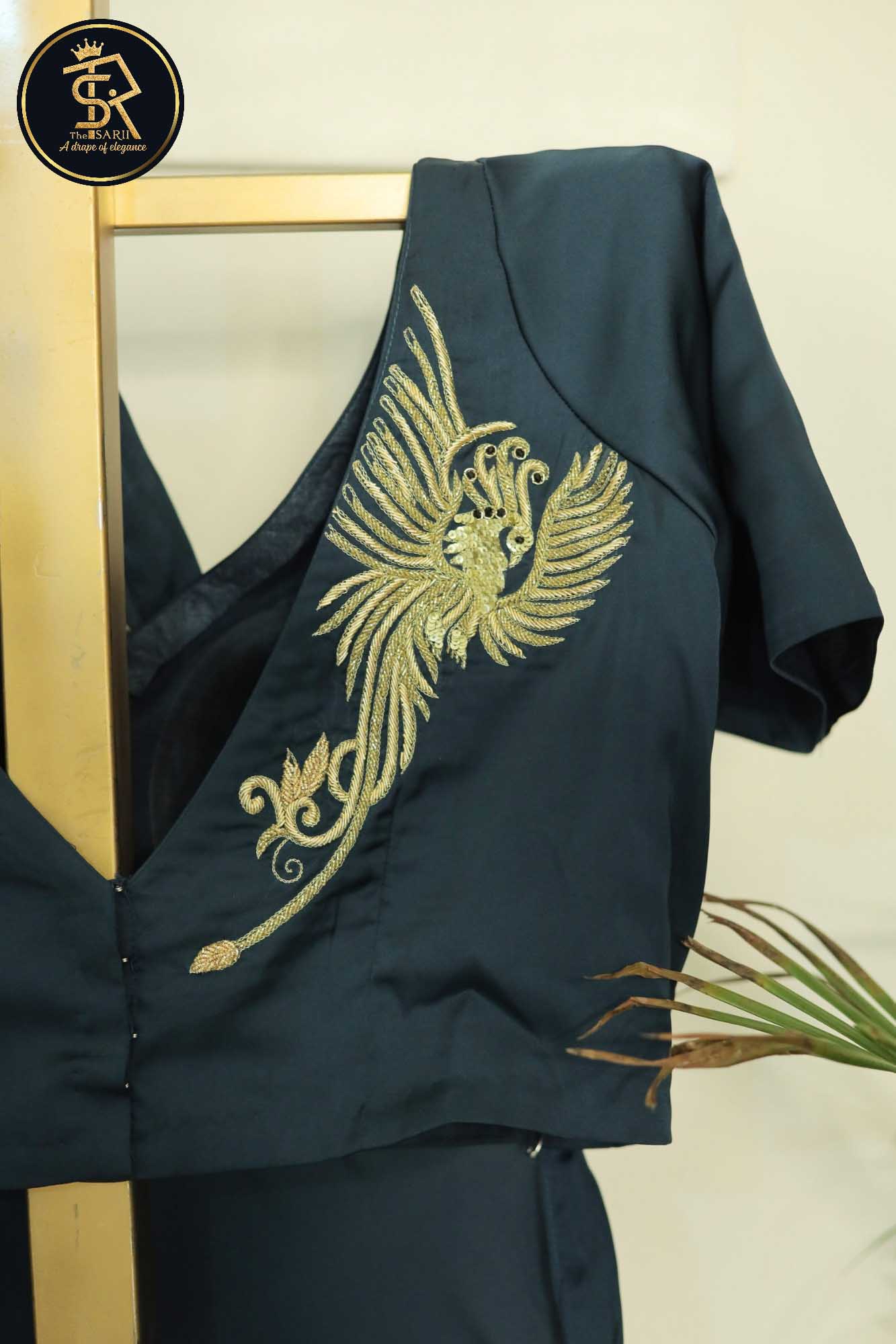 The highlight of this masterpiece is the exquisitely embroidered flying bird motif, a symbol of grace, freedom, and timeless beauty. Its delicate placement and fine detailing make the saree “speak elegance without saying a word.” Each thread and embellishment adds depth and sophistication, making the bird come alive against the rich satin backdrop.
