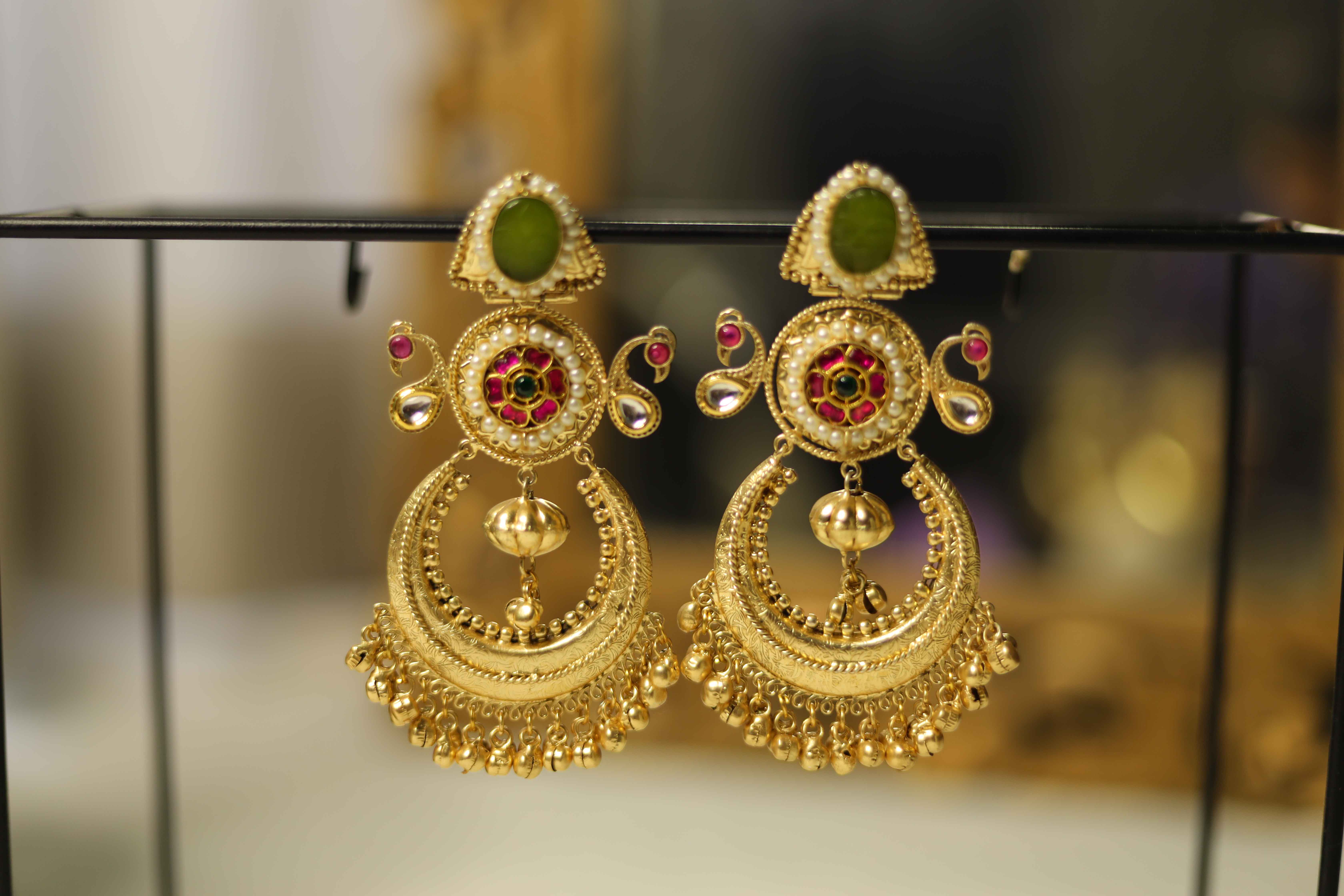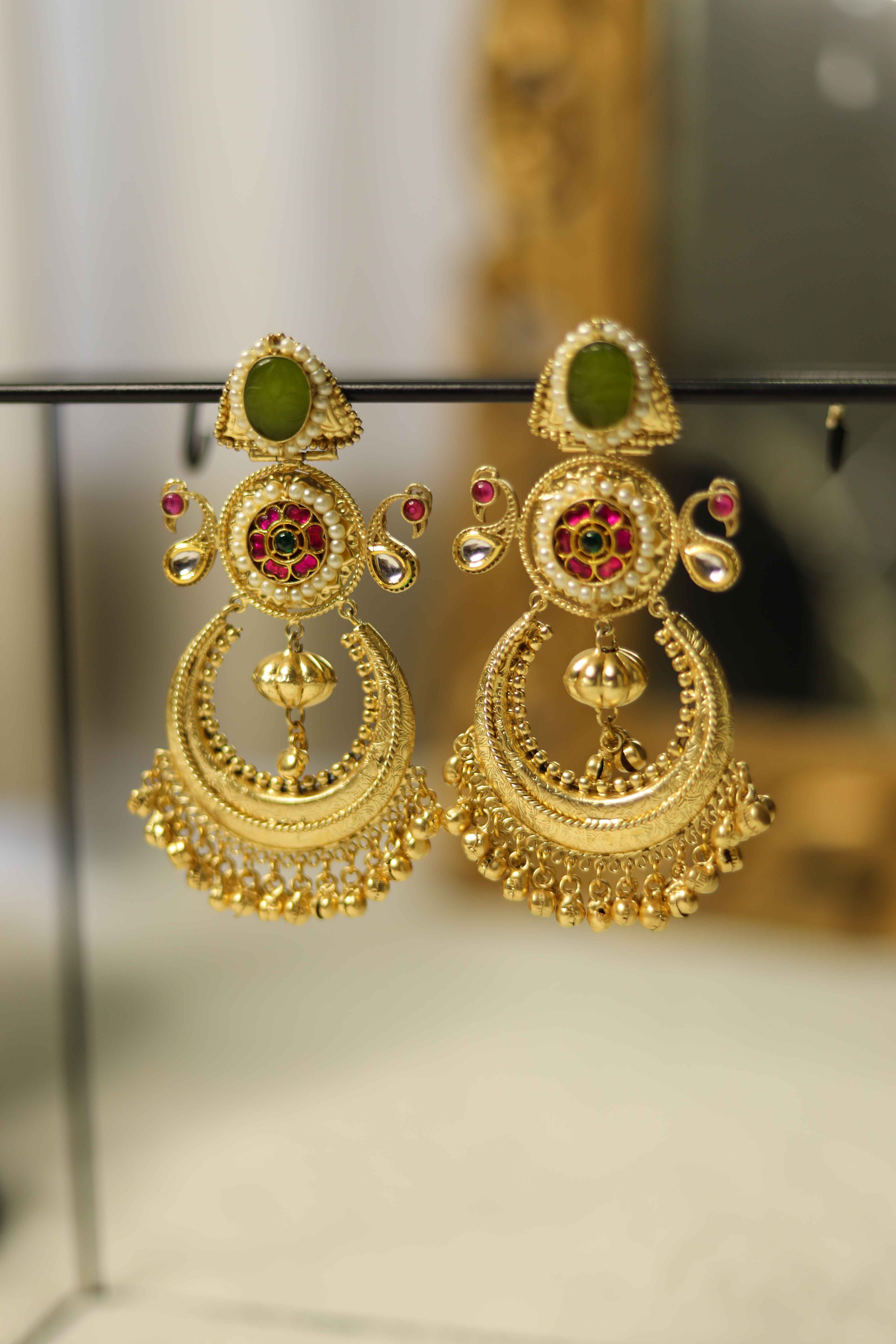 Elevate your traditional ensemble with these stunning antique gold-plated chandbali earrings. Featuring intricate Kundan work, pearl embellishments, and elegant red-green stone accents, these earrings exude timeless charm and regal sophistication. Perfect for weddings, festive celebrations, and ethnic occasions, they pair beautifully with sarees and lehengas for a royal finish.