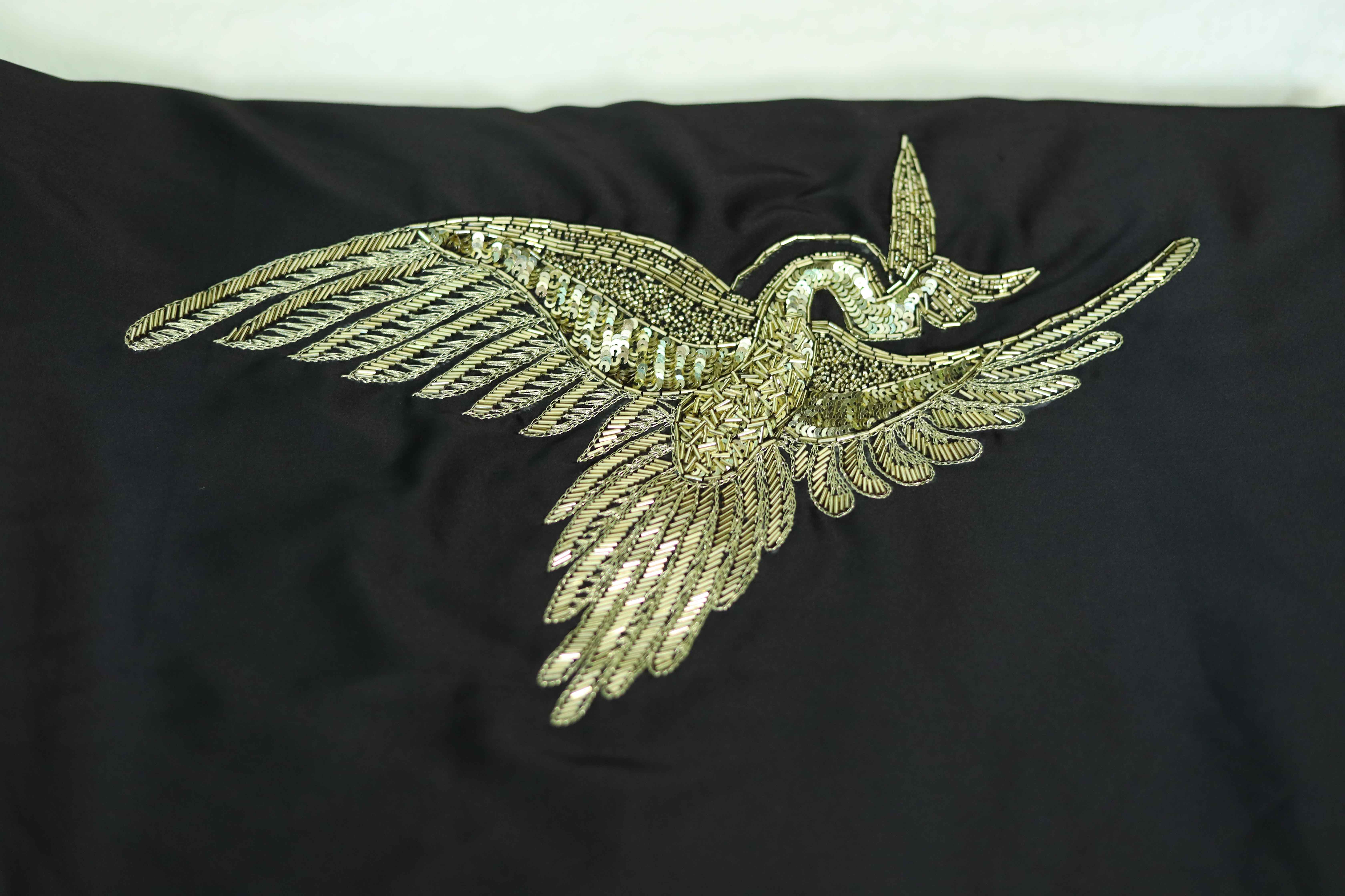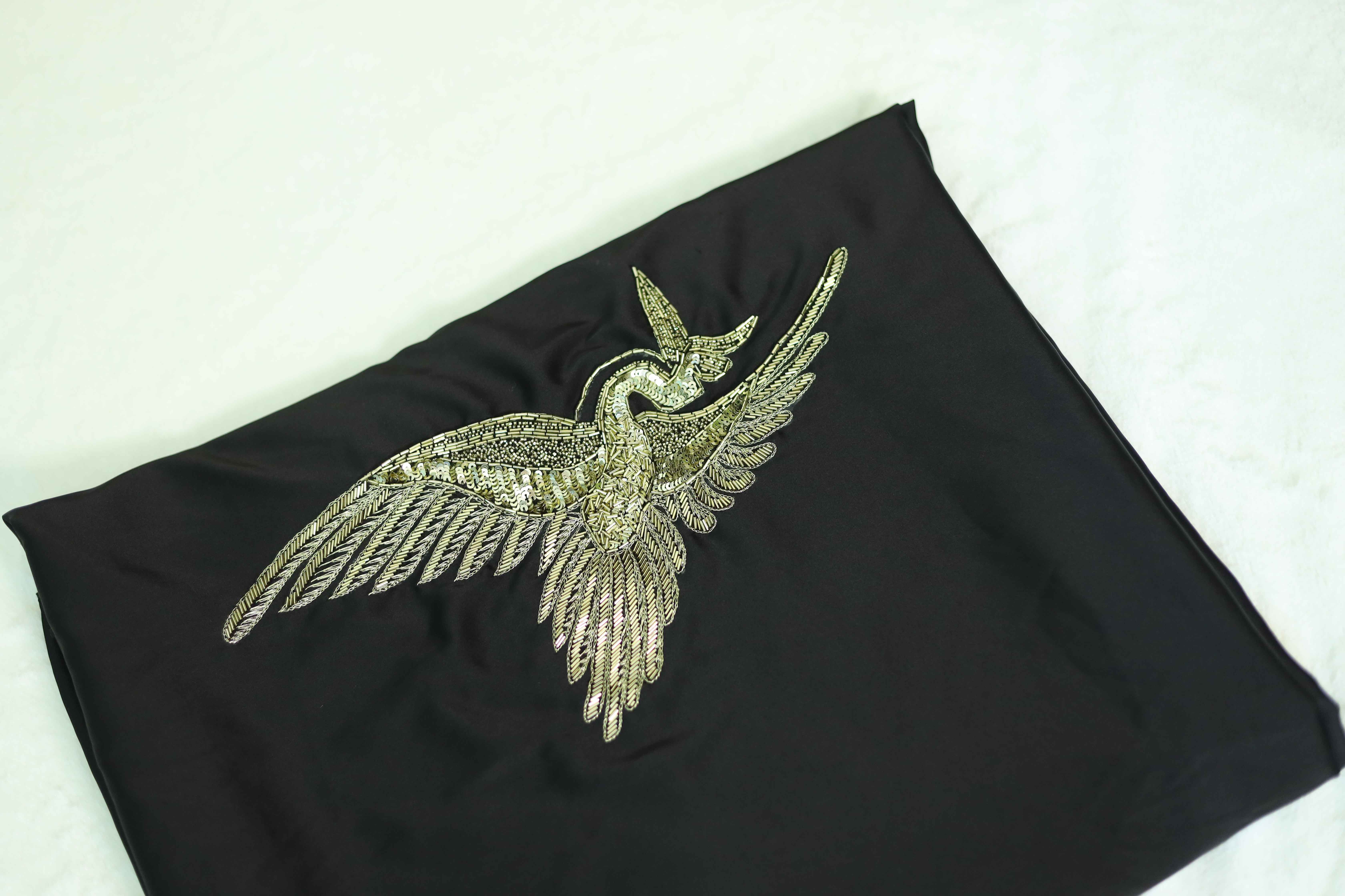 Drape elegance with this black saree adorned with intricate golden bird embroidery
