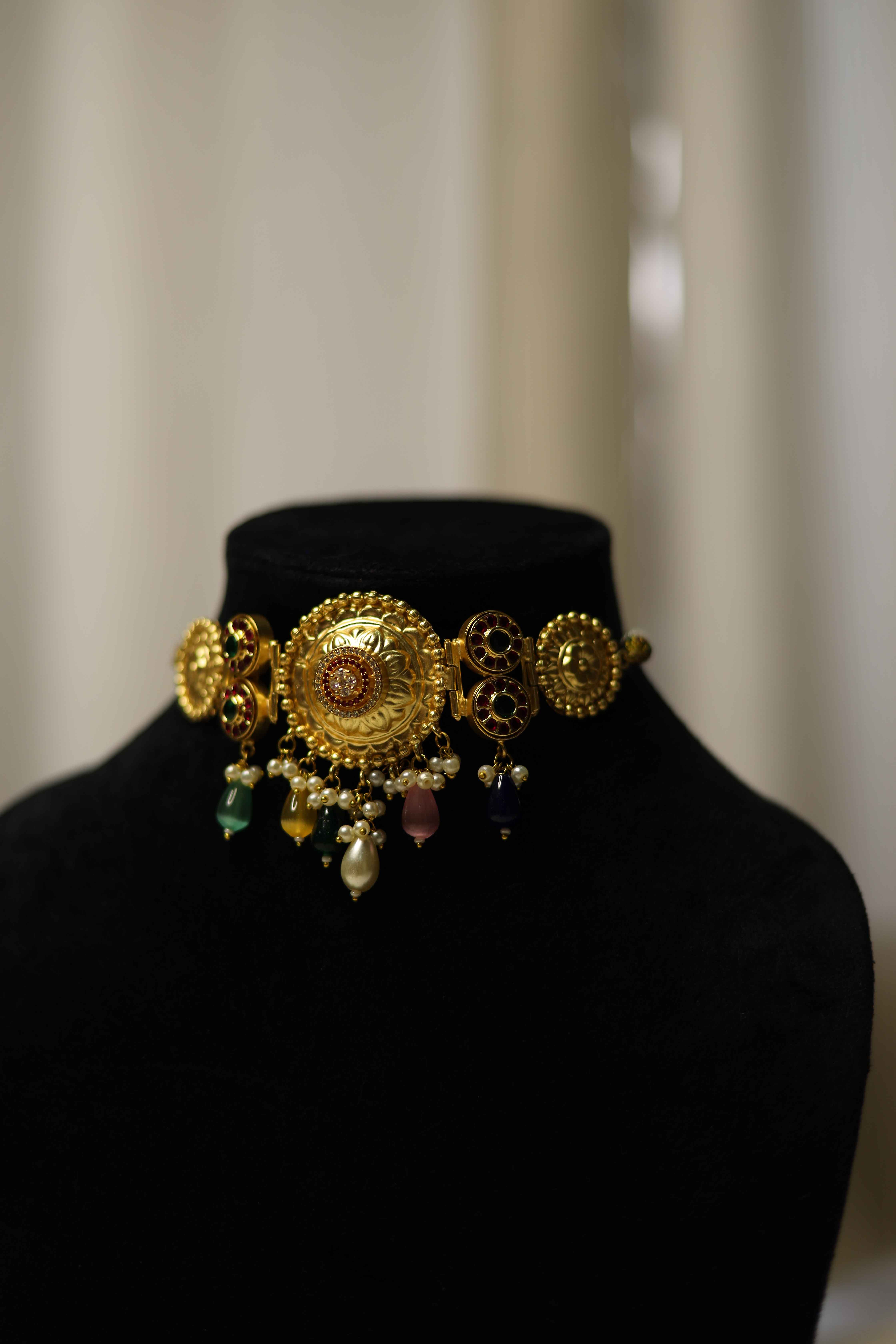 Embrace timeless heritage with this exquisite gold-plated choker set, featuring intricate circular motifs adorned with delicate detailing and multicolor bead danglers. The bold centerpiece adds a royal charm, while the matching jhumka earrings with pearl accents complete the look with grace. Perfect for weddings, festive occasions, and cultural celebrations, this choker set pairs beautifully with sarees, lehengas, and traditional attire, making you stand out with elegance and grandeur.